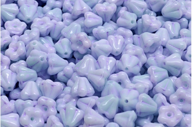 ベルフラワービーズ、ライトグリーン、コールドパープルの斑点(07524-33305)、ガラス、チェコ共和国