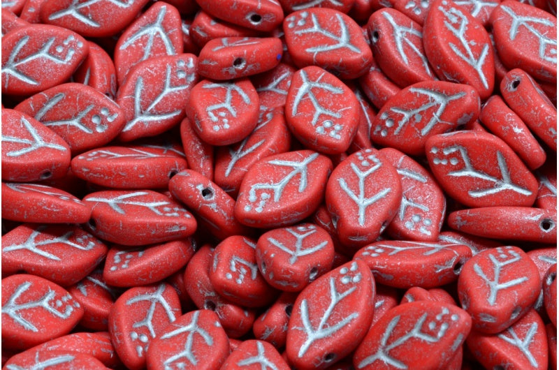 チェリーリーフビーズ、不透明レッドマットシルバーライン(93220-84100-54301)、ガラス、チェコ共和国