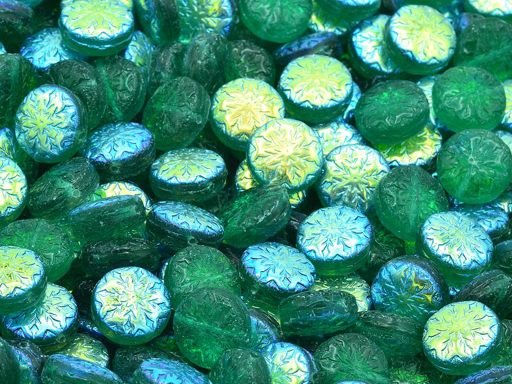 雪の結晶デザインのビーズ2、透明グリーンエメラルドAB(50720-28701)、ガラス、チェコ共和国