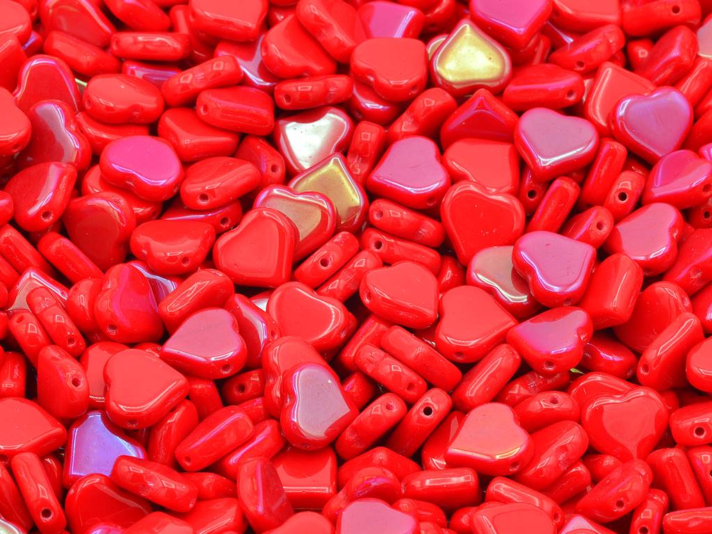 フラットハートビーズ サイドホール、不透明レッドAb(93200-28701)、ガラス、チェコ共和国