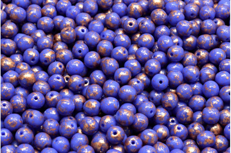 ラウンドドラックビーズ、不透明ブルーコッパースプラッシュ(33050-94402)、ガラス、チェコ共和国