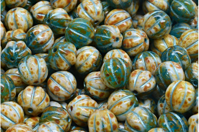 メロンビーズ、白透明アクアトラバーチンライトブルーライン(02010-60020-86800-54308)、ガラス、チェコ共和国