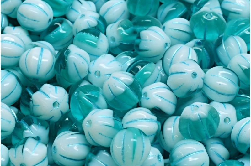 メロンビーズ、白透明アクアライトブルーライン入り(02010-60040-54308)、ガラス、チェコ共和国