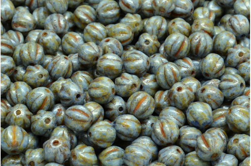 メロンビーズ、白緑光沢斑点(02010-65325)、ガラス、チェコ共和国