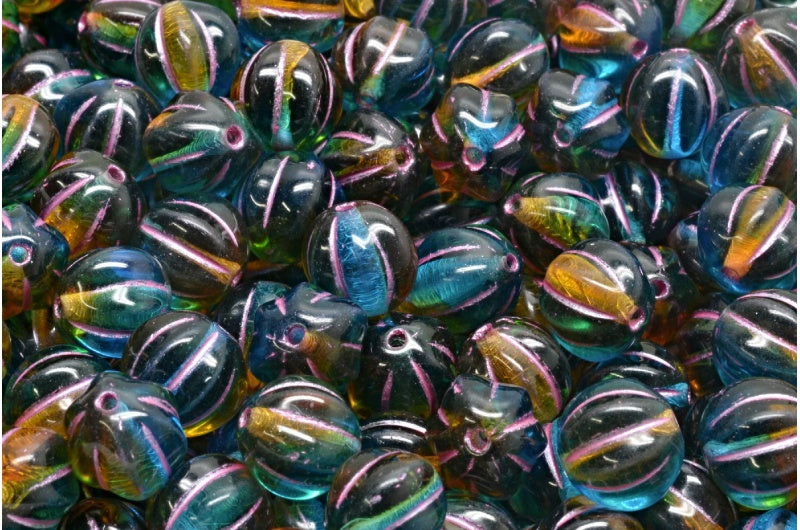 メロンビーズ、透明オレンジ、透明アクアピンクライン入り(10080-60040-54321)、ガラス、チェコ共和国
