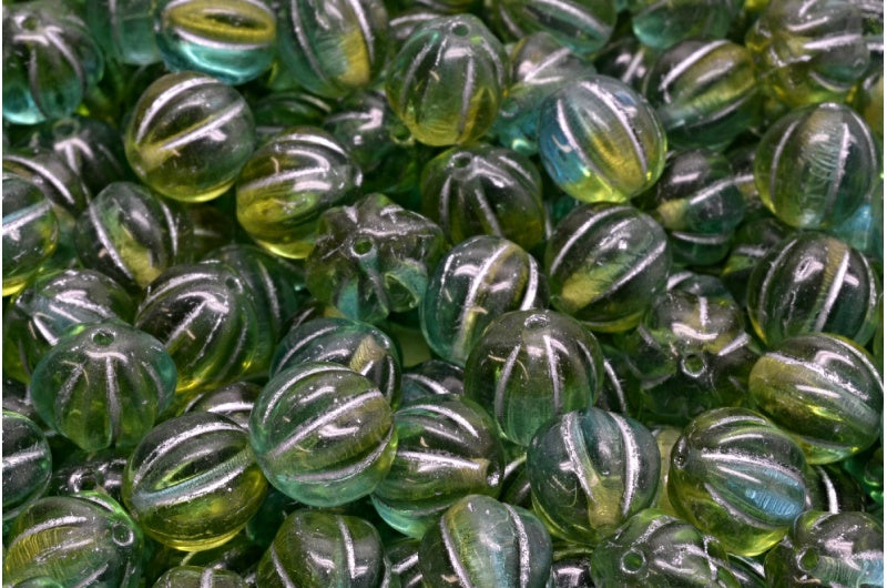メロンビーズ、透明グリーン、透明アクア、シルバーライン(50230-60000-54301)、ガラス、チェコ共和国