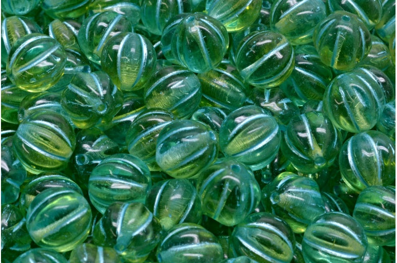 メロンビーズ、透明グリーン、透明アクア、ライトブルーのライン入り(50230-60000-54308)、ガラス、チェコ共和国