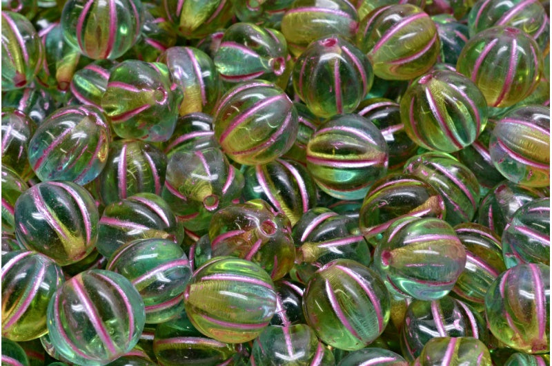 メロンビーズ、透明グリーン、透明アクアピンクライン入り(50230-60000-54321)、ガラス、チェコ共和国