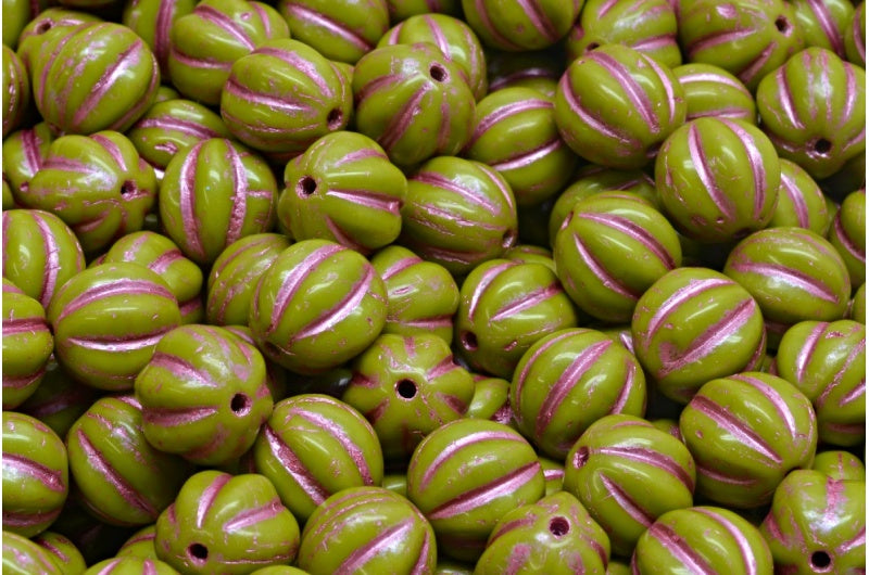 メロンビーズ、不透明グリーンピンクライン(53410-54321)、ガラス、チェコ共和国