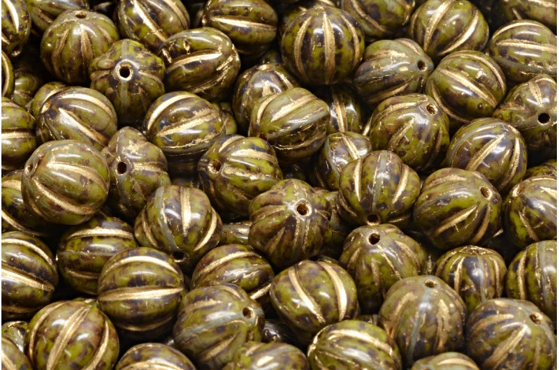 メロンビーズ、不透明グリーントラバーチン、金箔入り(53410-86800-54302)、ガラス、チェコ共和国