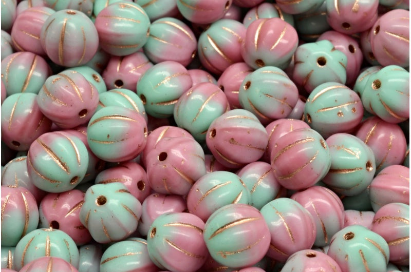 メロンビーズ、不透明ピンク、不透明グリーン、銅線入り(73010-53100-54307)、ガラス、チェコ共和国