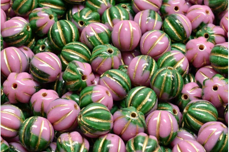 メロンビーズ、不透明ピンク、不透明グリーン、金線入り(73010-54100-54302)、ガラス、チェコ共和国
