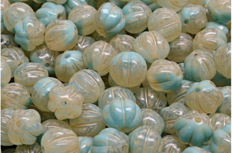 メロンビーズ、ブルーベージュトラバーチン斑点(R0641-33301)、ガラス、チェコ共和国