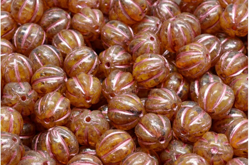 メロンビーズ、イエロートラバーチンピンクライン(R0812-86800-54321)、ガラス、チェコ共和国