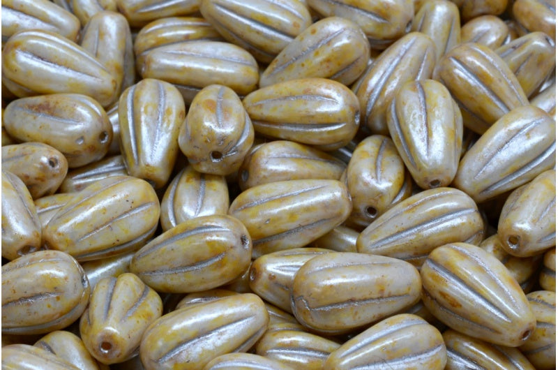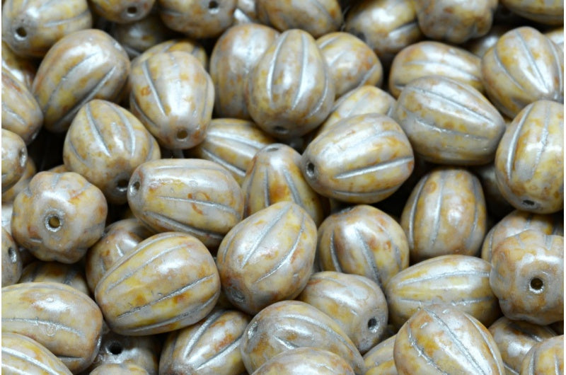 ドロップメロンビーズ、ホワイトクリームラスタースポットシルバーライン(02010-65321-54301)、ガラス、チェコ共和国
