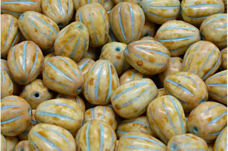ドロップメロンビーズ、ホワイトトラバーチンライトブルーライン(02010-86800-54308)、ガラス、チェコ共和国