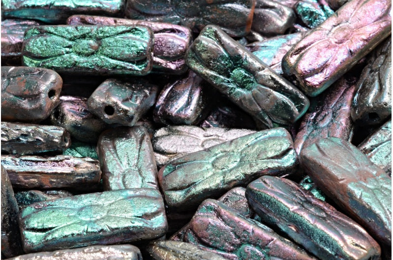 フラワーレクタングルビーズ、ブラックエッチングジェットブラックフルアプリコット(23980-etch-29123)、ガラス、チェコ共和国