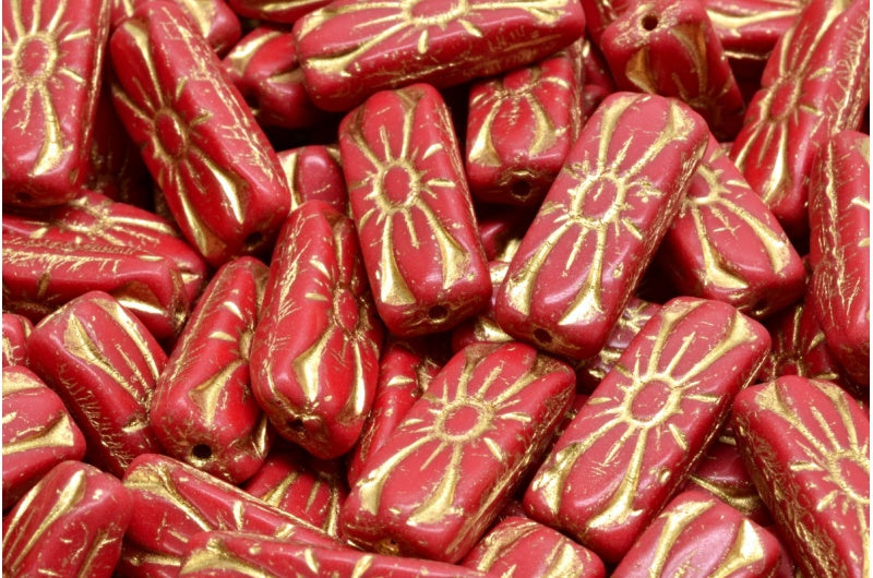 フラワーレクタングルビーズ、不透明レッドゴールドライン(93210-54202)、ガラス、チェコ共和国