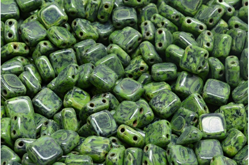 2穴プレスタイルビーズ、ブラックトラバーチングリーンスポット(23980-86800-33311)、ガラス、チェコ共和国