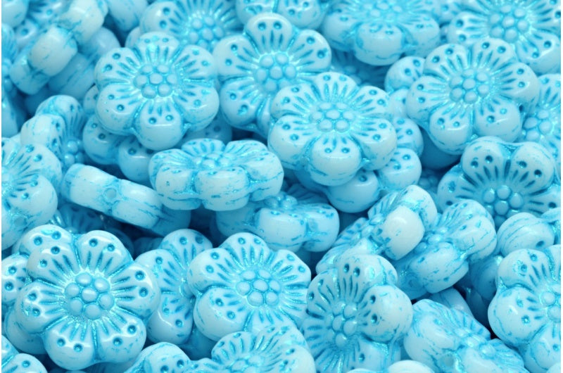 ボヘミアンフラワービーズ、ホワイトライトブルーライン(02010-43811)、ガラス、チェコ共和国