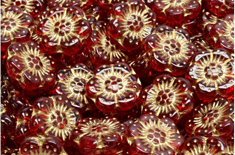 ボヘミアンフラワービーズ、ルビーレッドゴールドライン(90080-54302)、ガラス、チェコ共和国