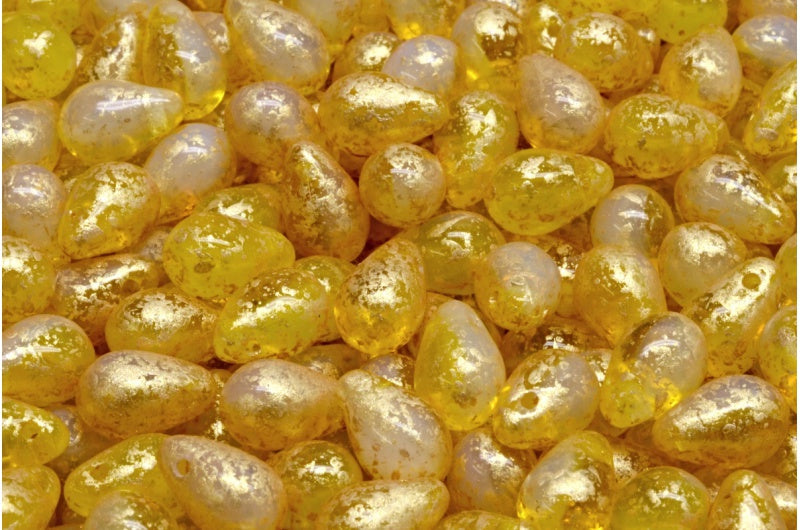 ドロップビーズ、オパールホワイト透明イエローゴールドスプラッシュ(01000-80020-94401)、ガラス、チェコ共和国