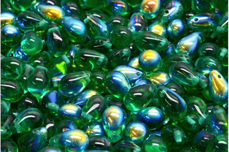 ドロップビーズ、透明グリーンエメラルドAb(50720-28701)、ガラス、チェコ共和国