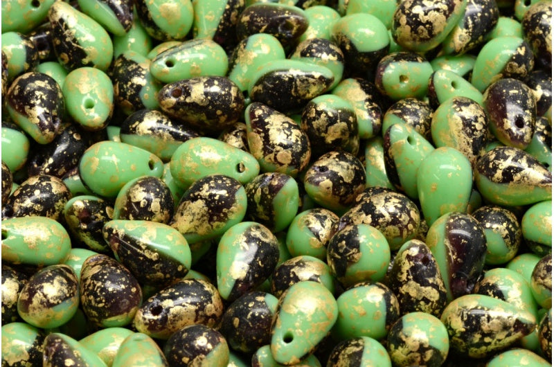 ドロップビーズ、不透明グリーン 20100 ゴールドスプラッシュ (53200-20100-94401)、ガラス、チェコ共和国