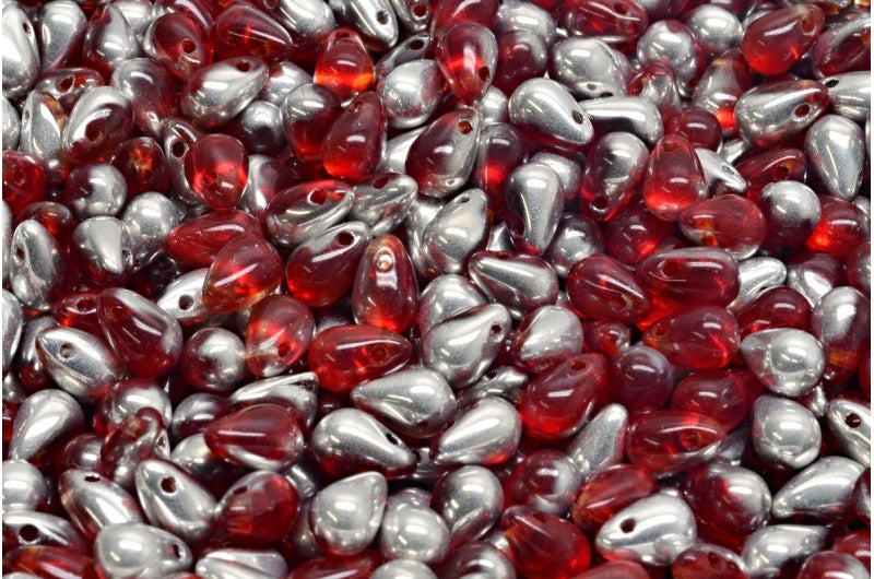 ドロップビーズ、ルビーレッド透明ライトトパーズイエロークリスタルシルバーハーフコーティング(90080-10020-27001)、ガラス、チェコ共和国
