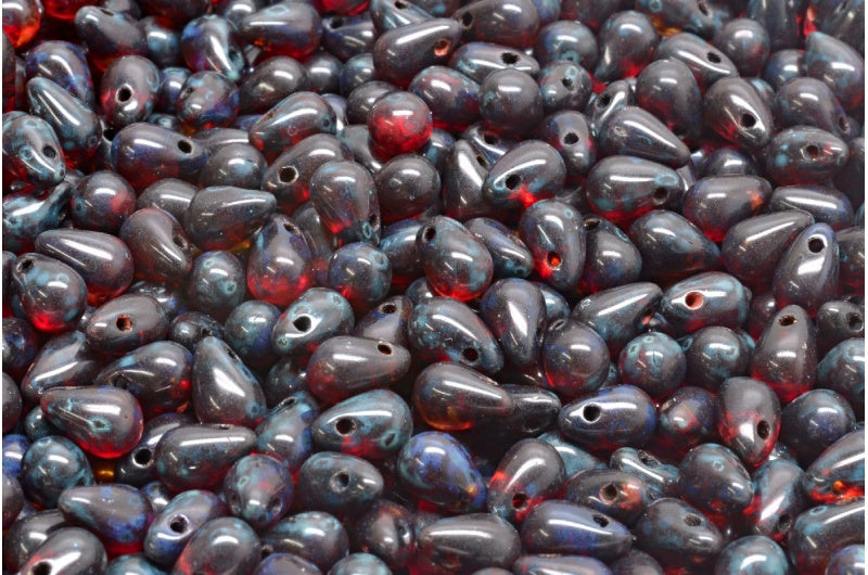 ドロップビーズ、ルビーレッド透明ライトトパーズイエロートラバーチン(90080-10020-86800)、ガラス、チェコ共和国