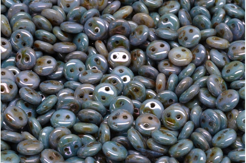 2穴レンズ豆ビーズ、ホワイトステイン、ラスターブルー(02010-65431)、ガラス、チェコ共和国