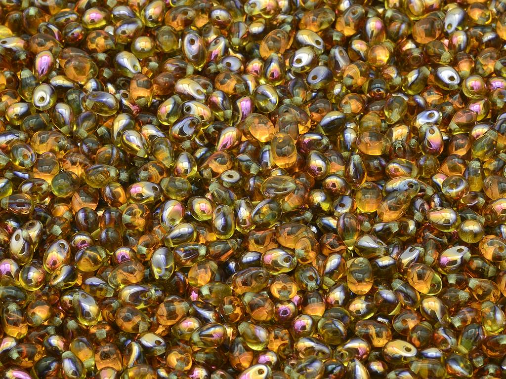 ドロップビーズ、透明オレンジクリスタルピンクイエローコーティング(10040-27137)、ガラス、チェコ共和国
