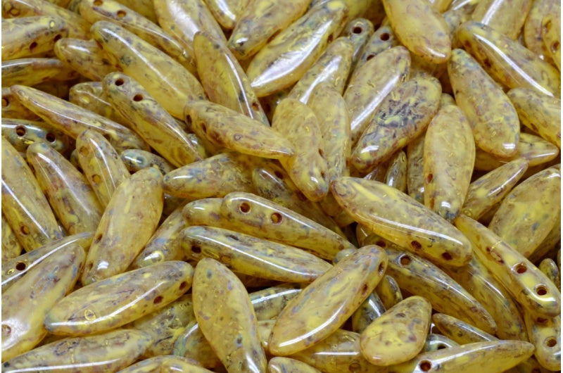 2穴ダガービーズ、クリスタルトラバーチンベージュイエロースポット(00030-86800-33303)、ガラス、チェコ共和国