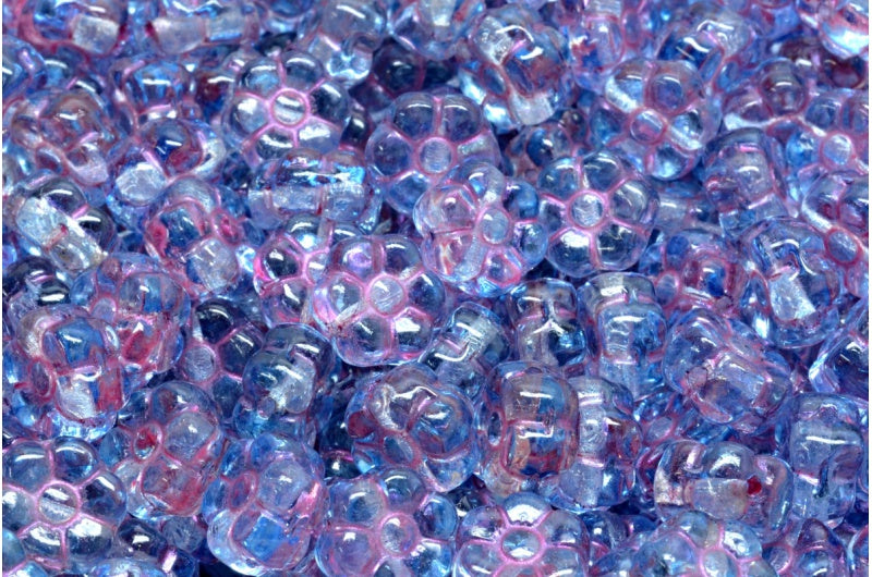 フラットフラワービーズ、クリスタルピンクラインライトブルー(00030-43807-34307)、ガラス、チェコ共和国