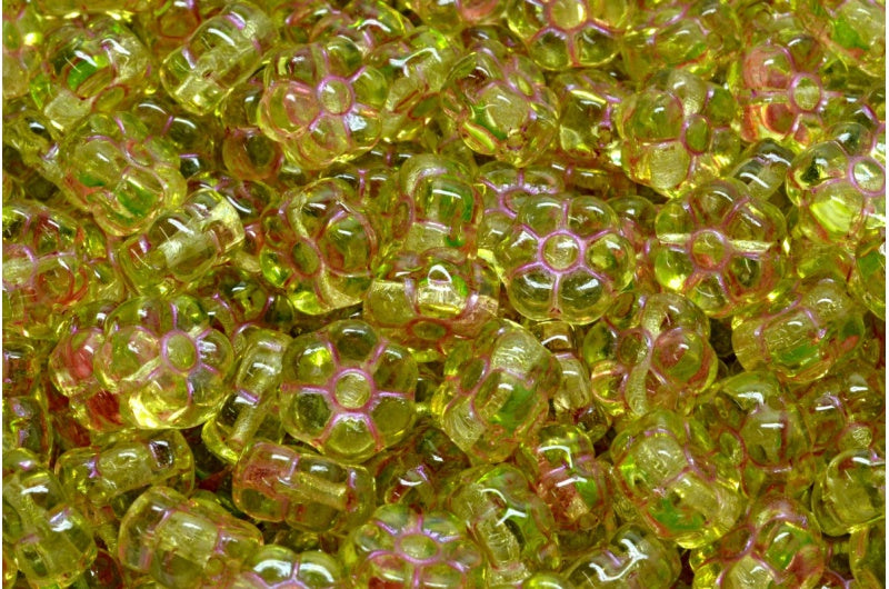 フラットフラワービーズ、クリスタルピンクラインライトグリーン(00030-43807-34310)、ガラス、チェコ共和国