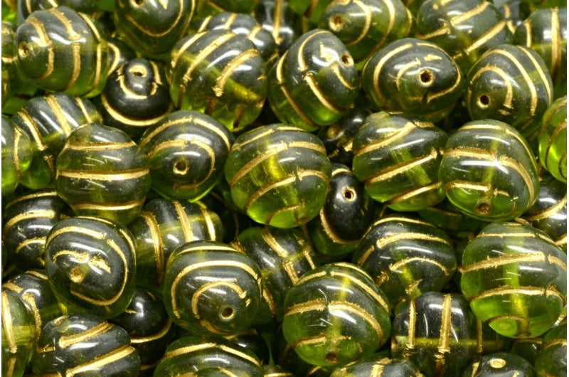 ライン入りオーバルビーズ、透明グリーンゴールドライン入り(50230-54302)、ガラス、チェコ共和国