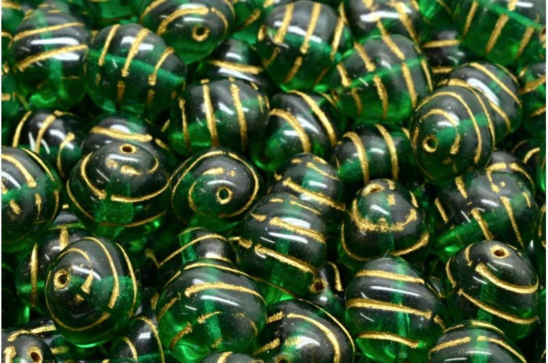 ライン入りオーバルビーズ、透明グリーンエメラルドゴールドライン(50710-54302)、ガラス、チェコ共和国