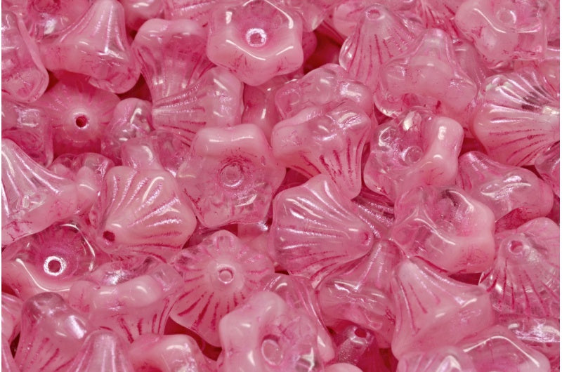 フラワーベルビーズ、不透明ピンク、ピンクライン入り(76018-54321)、ガラス、チェコ共和国