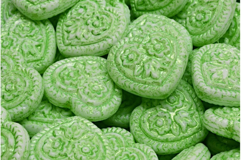 フォークロアの花のビーズがあしらわれたハート、ホワイトオパールグリーン(02020-43813)、ガラス、チェコ共和国