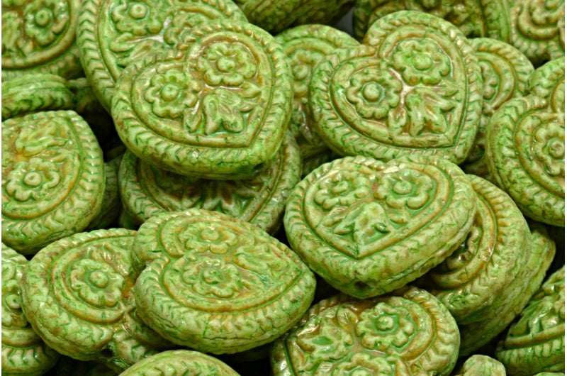 フォークロアの花のビーズが入ったハート、ホワイトオパールトラバーチングリーンスポット(02020-86800-33311)、ガラス、チェコ共和国