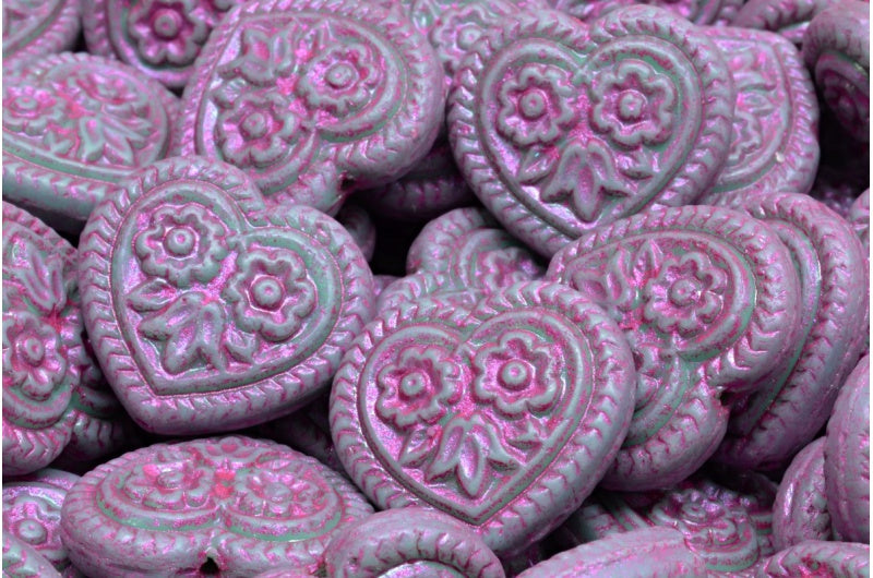 フォークロアの花のビーズがあしらわれたハート、ターコイズピンクのライン入り(63130-43807)、ガラス、チェコ共和国
