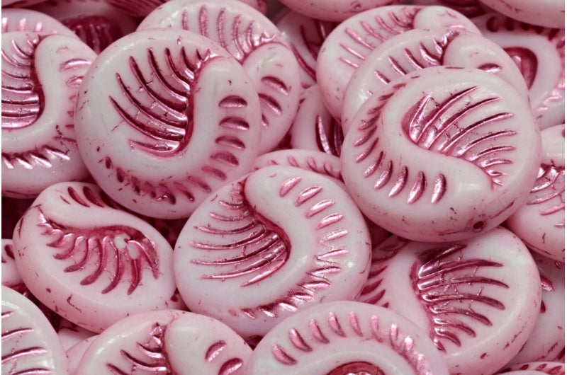 化石コインビーズ、ホワイトマットピンクライン(02010-84100-54321)、ガラス、チェコ共和国