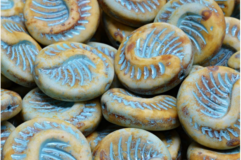 化石コインビーズ、ホワイトマットトラバーチンライトブルーライン(02010-84100-86800-54308)、ガラス、チェコ共和国