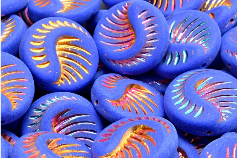 化石コインビーズ、リッチブルー スリペリット フル(2Xサイド)マット(33060-29503-84100)、ガラス、チェコ共和国
