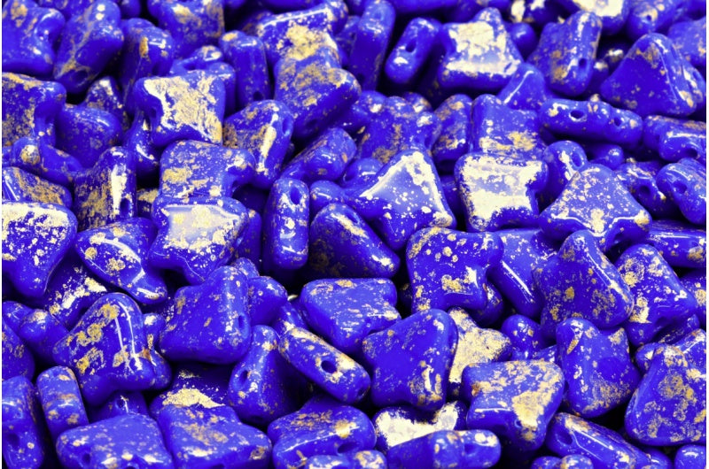 2穴フラットチューリップベルビーズ、不透明ブルーゴールドスプラッシュ(33050-94401)、ガラス、チェコ共和国