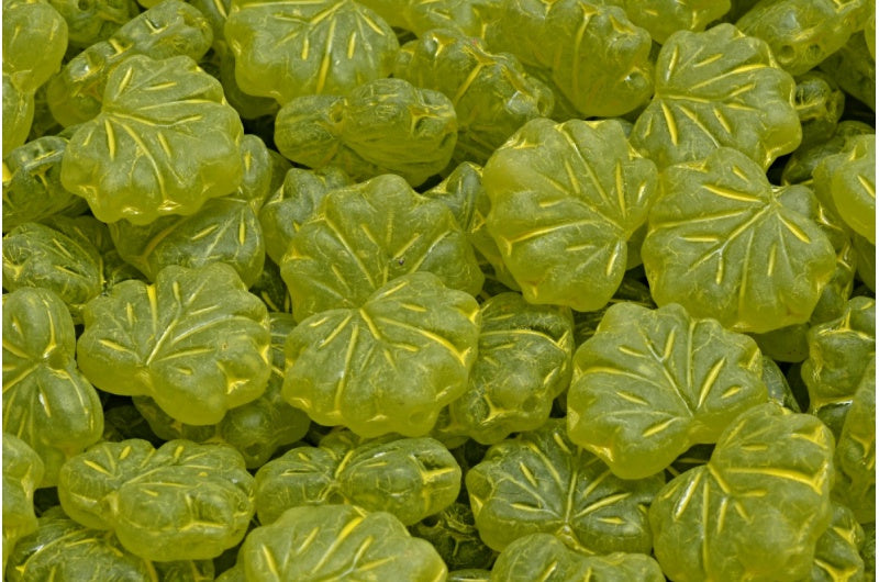 メープルリーフビーズ、透明グリーンマットベージュイエロースポット(50220-84100-33303)、ガラス、チェコ共和国