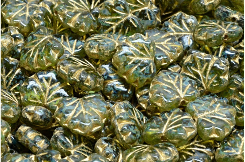 メープルリーフビーズ、透明グリーントラバーチン、金張り(50220-86800-54302)、ガラス、チェコ共和国