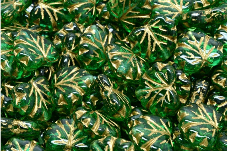 メープルリーフビーズ、透明グリーンゴールドライン(50420-54302)、ガラス、チェコ共和国