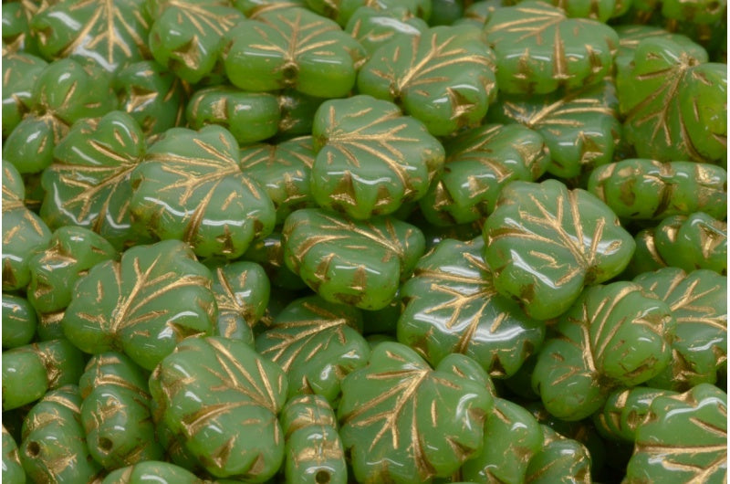 メープルリーフビーズ、オパールグリーンゴールドライン(51010-54302)、ガラス、チェコ共和国