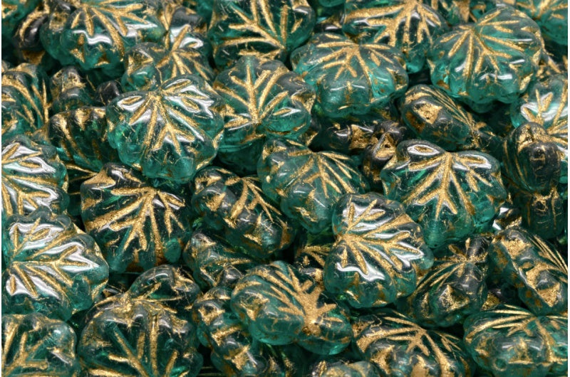 メープルリーフビーズ、透明アクアゴールドライン(60220-54302)、ガラス、チェコ共和国
